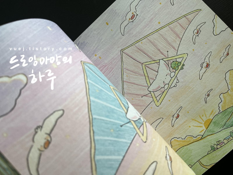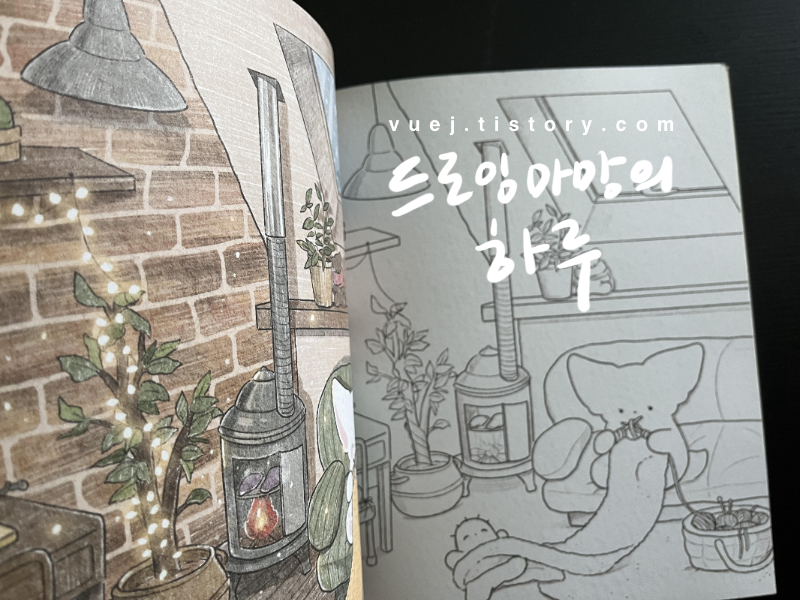페이지를 열면 한쪽은 작가님이 색칠한 완성된 이미지가 있고 그 옆에 라인으로만 그려진 페이지가 있어서 아이가 작가님의 그림을 보면서 느낌을 따라 하기도 하고 조금 기분에 따라 색을 다르게 바꿔보기도 하고 유연하게 하더라고요. 예시가 있으니 마음 편하게 시작하고 색칠하는 것이 익숙해지면 요리조리 내 취향대로 바꾸기도 해서 그림 그리고 싶은데 시작하는 것이 어려운 아이나 어른들에게 괜찮은 선물이 되겠구나 생각했어요. 사실 이 책은 아이들용을 나왔다기보다는 나이불문 두루두루 사용하기 좋은 촌스럽지 않은 그럴듯하게 귀여운 색칠공부거든요. 그러데이션 부분도 많은 편인데 그러데이션을 그리려면 손힘의 강약이 중요하거든요. 손힘 떨어지시는 부모님들 선물로도 좋지 않을까 생각해 봅니다.