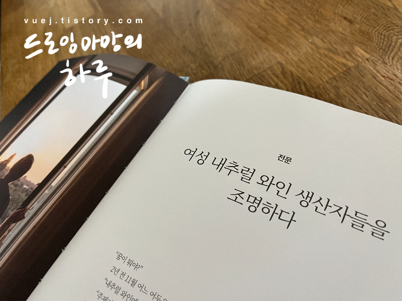 가끔 뱅쇼를 만드는데 와인을 사용하는 저로써는 와인맛에 대해 무지하지만 늘 얕은 관심은 있어서 마음에 드는 책을 발견하고 서슴없이 일단 펼쳐봅니다. 이 책은 다른 와인 관련 책과 다르더라고요. 여성 와인 생산자들의 이야기가 킨포크 스타일의 사진과 인터뷰로 가득합니다. 일단 그것으로 마음이 90% 훅 쏠렸고요 담담한 서사들에 가벼운 마음으로 볼 수 있겠다 싶어서 빌렸어요.