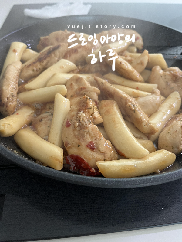 1. 기름을 넣고 처음엔 센 불로 고기를 굽는다 (저희는 떡볶이떡도 함께 구웠어요 :)