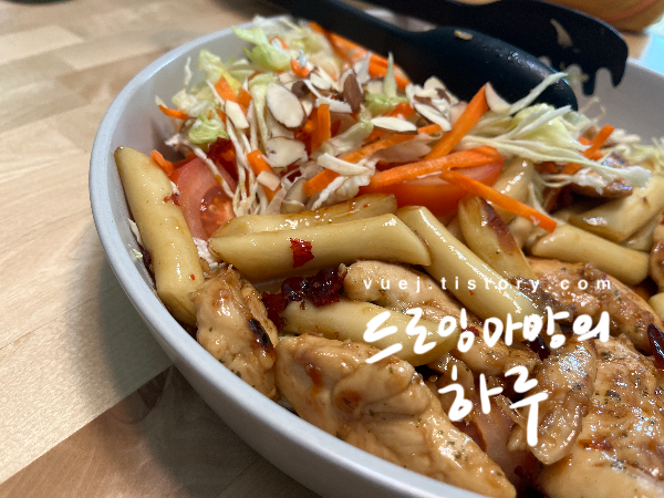 닭고기 300g 분량 소스예요. 위의 재료를 모두 섞어 주면 소스 완성! 닭고기, 돼지고기 모두 잘 어울려요. 유용한 팁 하나! 재료를 준비하는 동안 맛술에 재워놨다가 사용하시면 정말 부드러운 고기 질감을 누리실 수 있어요. 저는 냉장고에 재워놨다가 사용하는 편이에요.