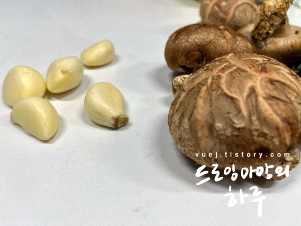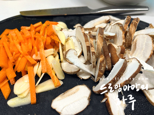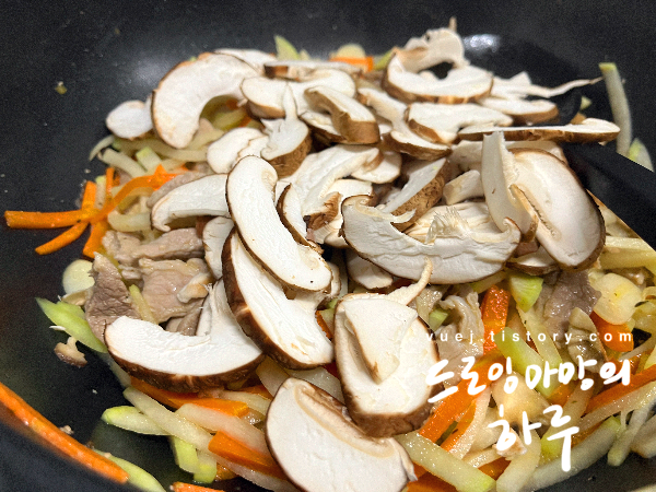 표고버섯을 미리 넣으면 크기도 많이 작아지고 향도 덜 나는거 같아서 마지막에 살짝 볶아주는 정도로만 하셔도 좋아요. 단 표고향이 싫으신 분은 다른 무향인 버섯으로 대체하셔도 무방해요.