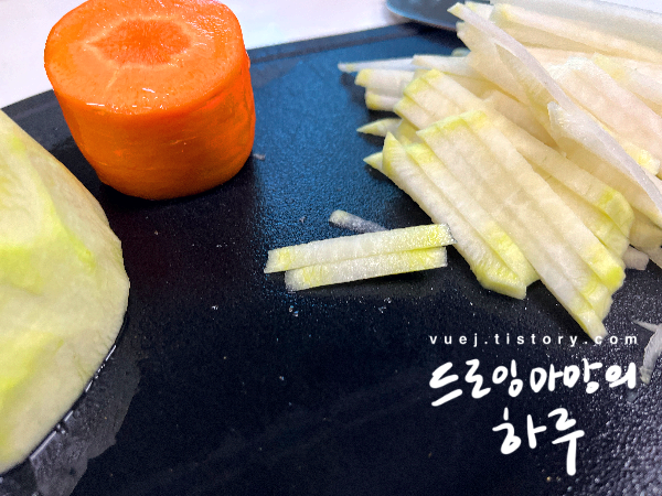 * 무는 채쳐서 소금에 절여 놓으면 간이 짭잘해서 맛있어요. 짠음식이 별로라면 그냥 채썰어서 사용하시면 되요