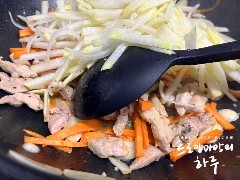 저는 당근도 먼저 넣었는데 아삭한 식감이 좋으미녀 나중에 야채 넣을 때 같이 넣으셔도 되요.