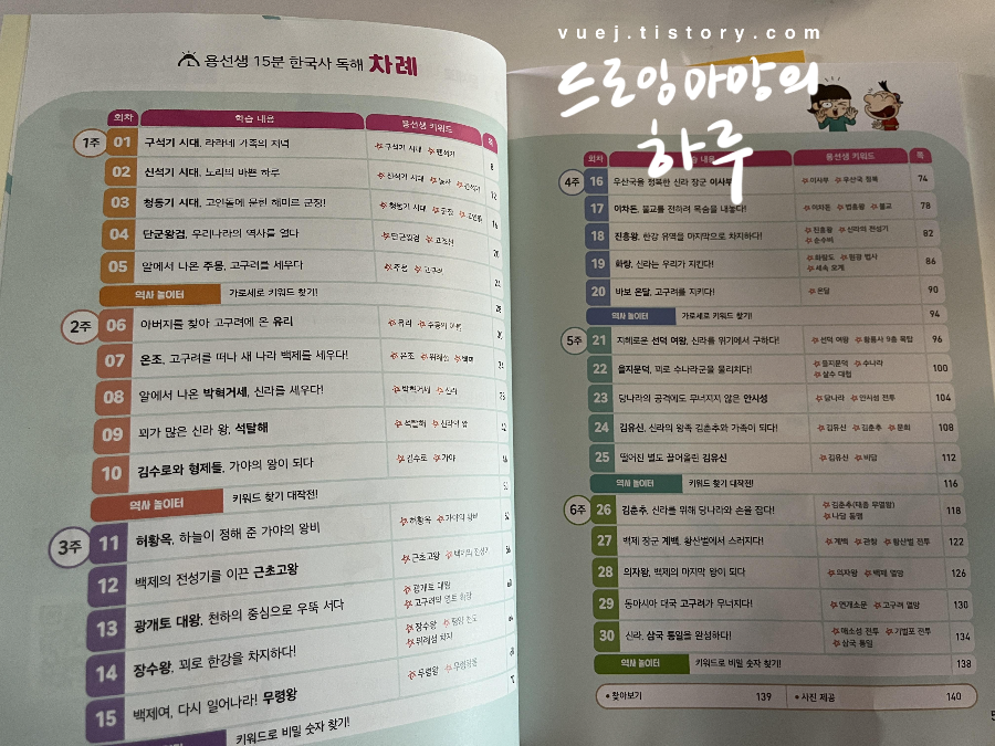 시리즈로 되어 있어서 앞으로 꾸준히 진행할 예정이에요. 아이반응도 좋아서 만족. 진행하실 때 한국사를 완전히 마스터한다는 생각보다는 한번 훑어본다는 느낌으로 공부하는 것이 좋아요. 학교에서 한국사 수업 들을 때 자세히 기억은 안 나지만 어디서 들어본 거 같다는 느낌 정도면 충분하다고 생각해요. 친숙함이 자신감으로 이어지기를 바라며 잘 활용하시기를 바라봅니다.