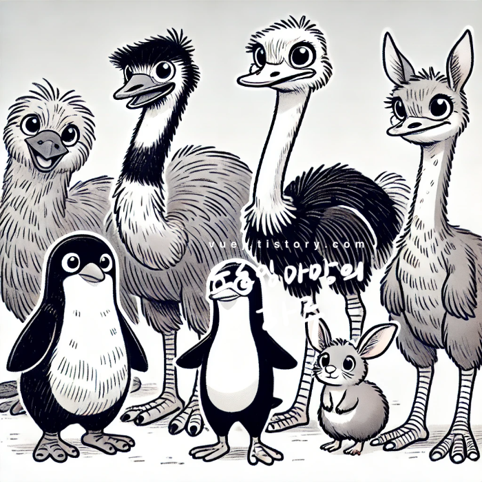 타조처럼 날지 못하는 새는 타조만 있는 게 아니에요! 타조 외에도 에뮤, 키위, 그리고 펭귄 같은 새들도 날 수 없답니다. 이 새들도 각자의 환경에 맞게 진화해서 날개가 필요 없게 되었어요. 펭귄은 날개를 물속에서 헤엄치는 데 사용하고, 키위는 작은 몸으로 숲 속을 걸어 다니며 먹이를 찾죠.