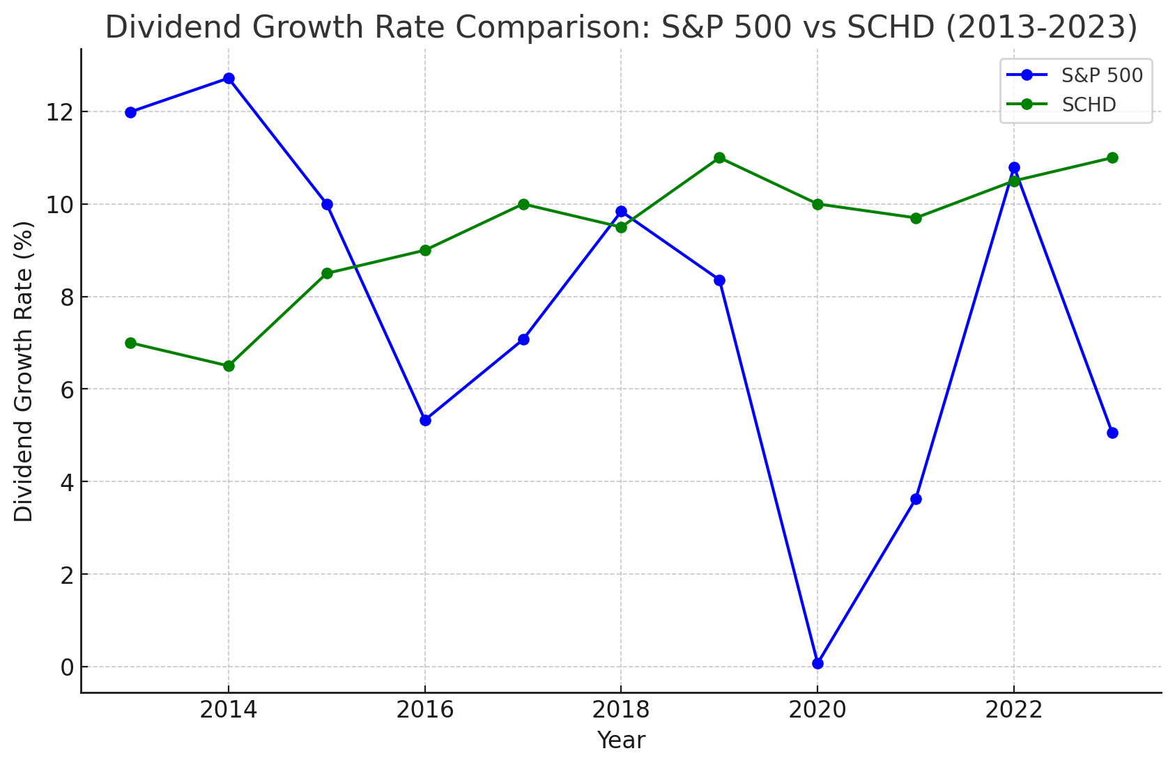 - S&P 500과 SCHD의 배당 성장률 비교 (2013-2023)