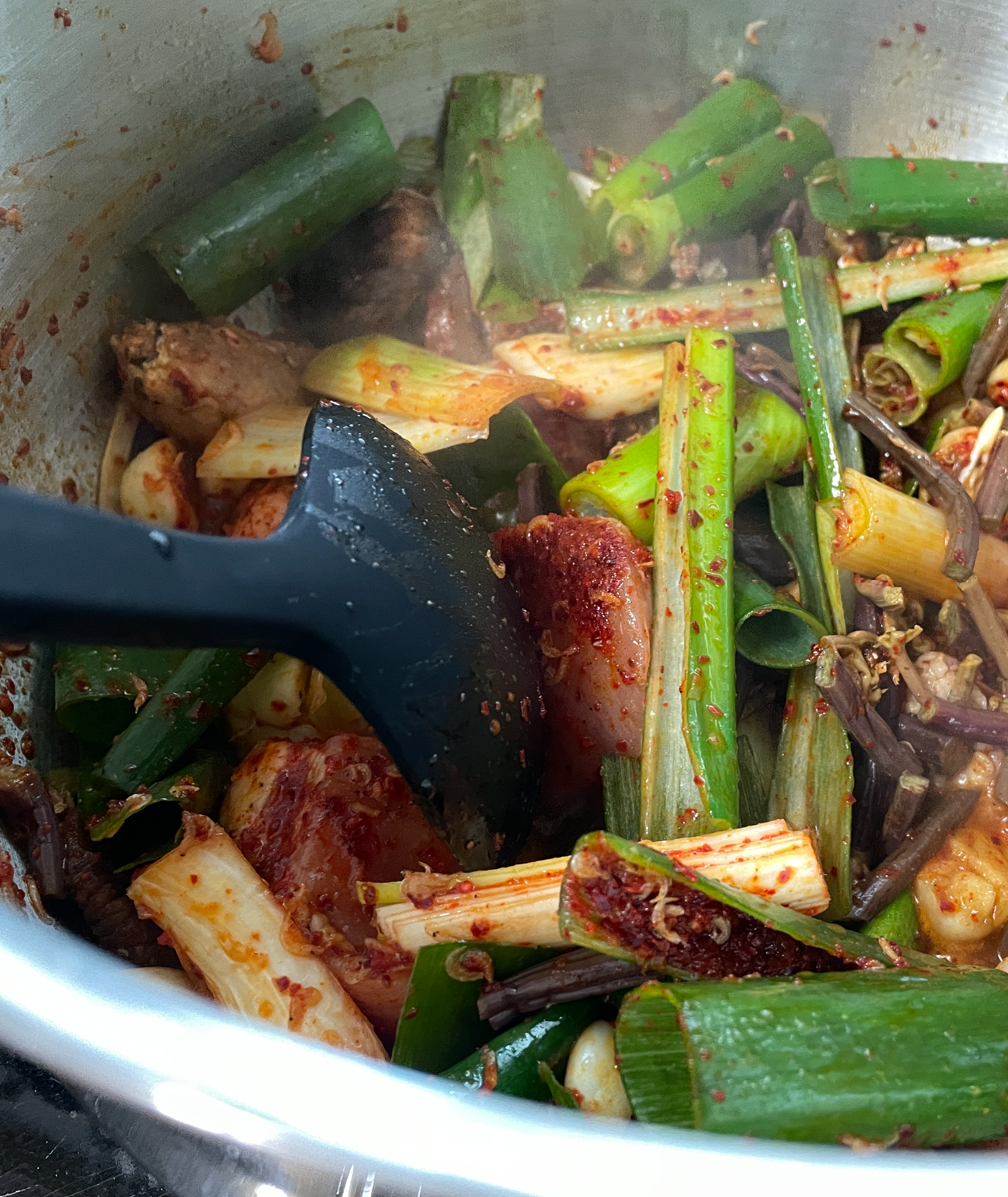 1. 압력밥솥에 1번 재료 모두를 마음대로 잘라서 고기가 살짝 익을 때까지 볶아요