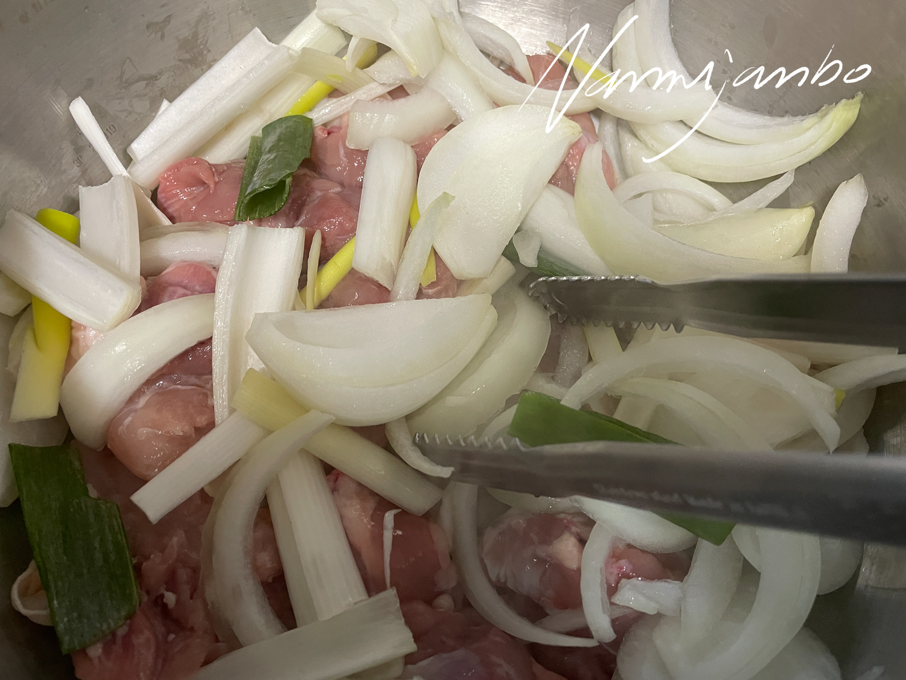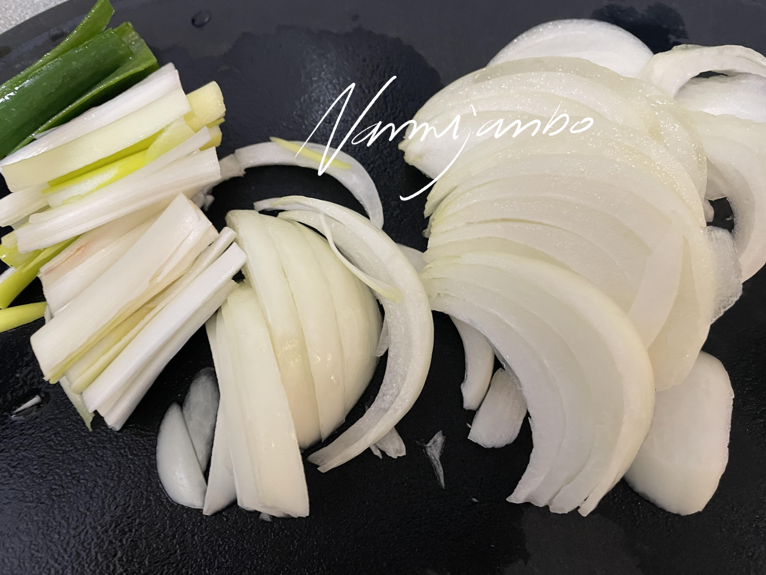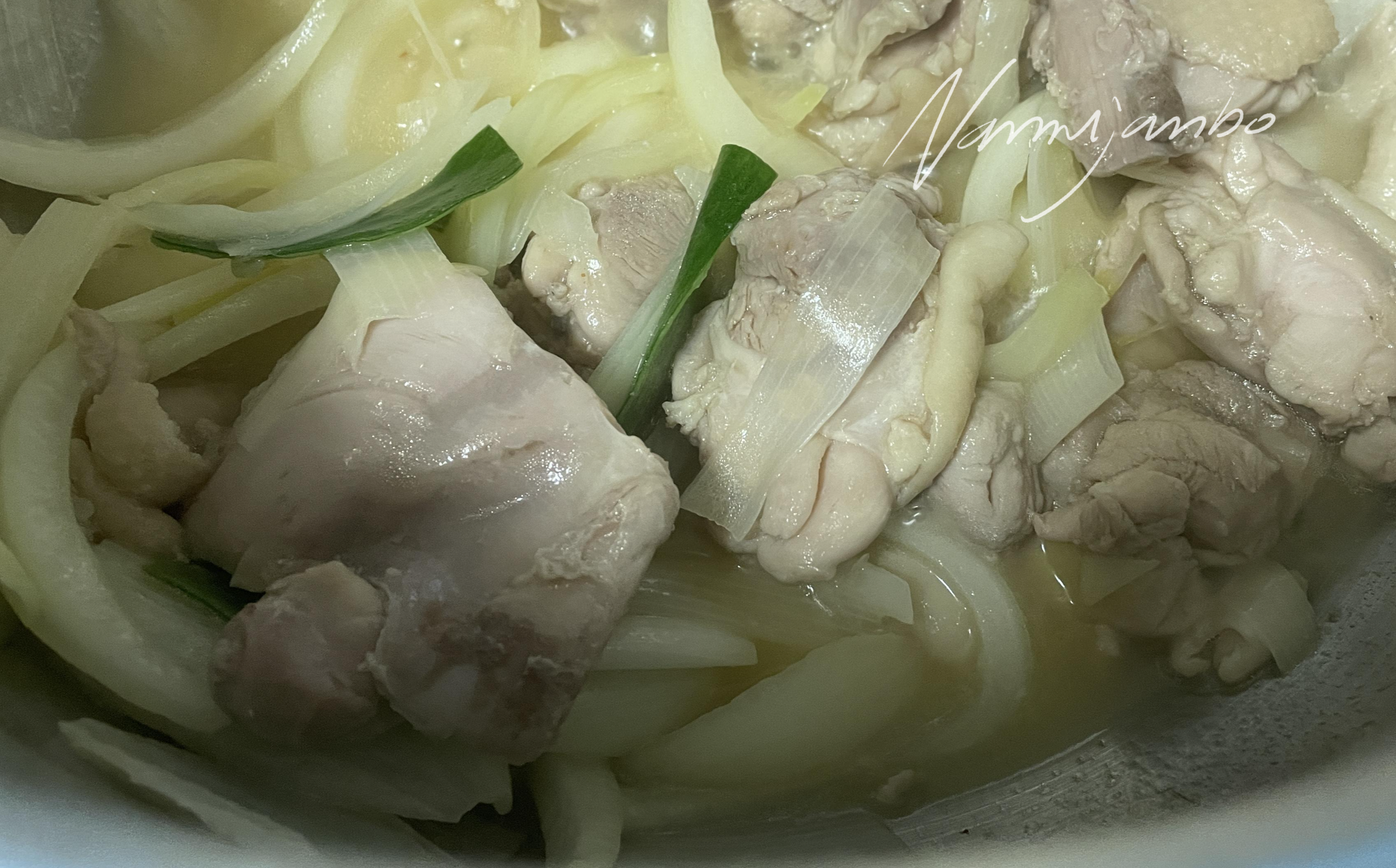1. 닭다리살(껍질이 아래로 향하게 한다 껍질 기름으로 구우는 것이므로), 양파, 파, 버터 약간을 넣고 볶는다