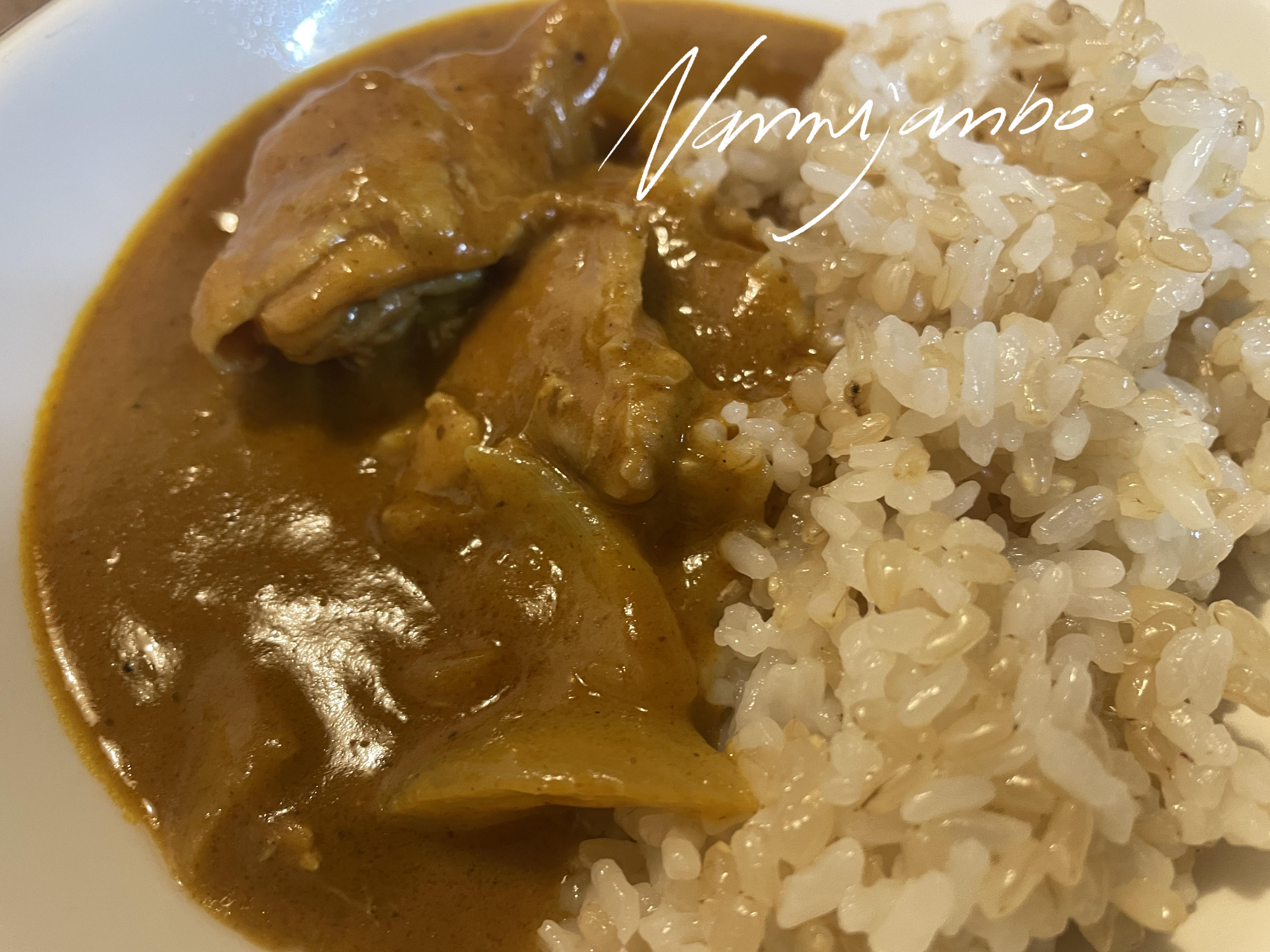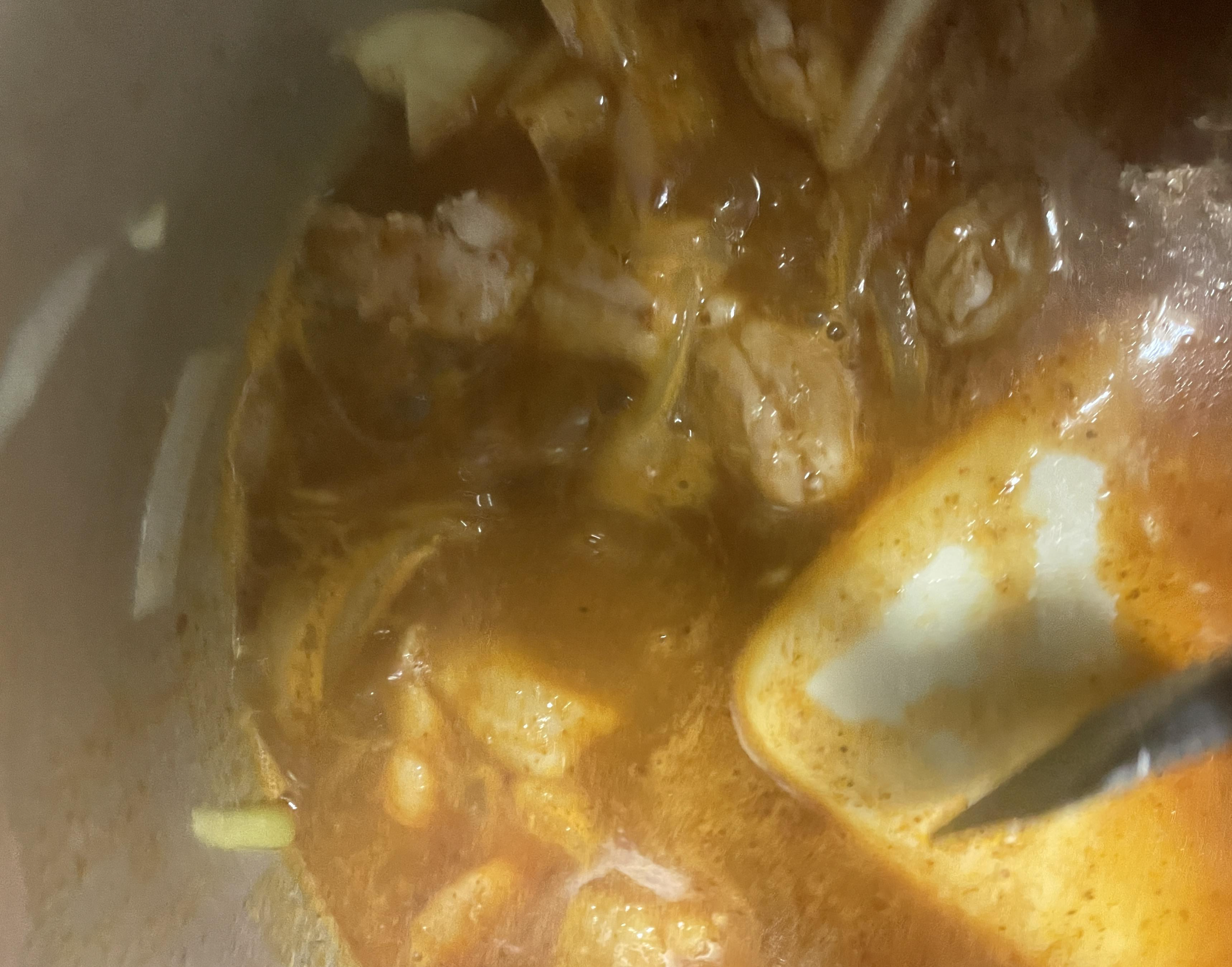 2. 야채와 닭다리살이 노릇하게 익으면 물과 섞은 카레와 생크림을 넣고 20-30분 끓인다