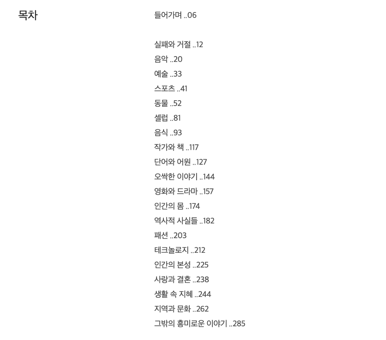 일상에서 글감을 얻기 힘들 때 어떤 방법을 사용하시나요? 저는 생각을 확장하기 위해 꾸준히 책을 보고 있는데요 무조건 정독하는 스타일은 아니에요. 어떤 책은 잡지 보듯이 보고 어떤 책은 꼼꼼히 정독해서 심지어 기록을 해가면서 읽기도 하는데 이 책은 잡지처럼 관심 있는 분야를 펼쳐서 읽어보시면 재미있는 글감들이 많아요. 궁금증을 유발하는 글이라고 해야 할까요?