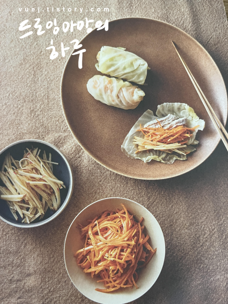 2. Cabbage planting is hard, so it's not easy to dry, but in this case, put the cabbage planting horizontally and roll it. Then you can eat the hard parts comfortably without having to curl them.