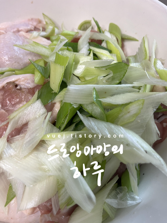1. 닭다리살을 꺼내서 대파, 소금, 생강가루, 올리브유를 적당히 넣고 조물조물해서 면 삶는 시간 동안 둡니다. 소금 간은 약간 싱겁게 하는 것이 좋아요. 마무리 단계에서 조절해 주면 됩니다.