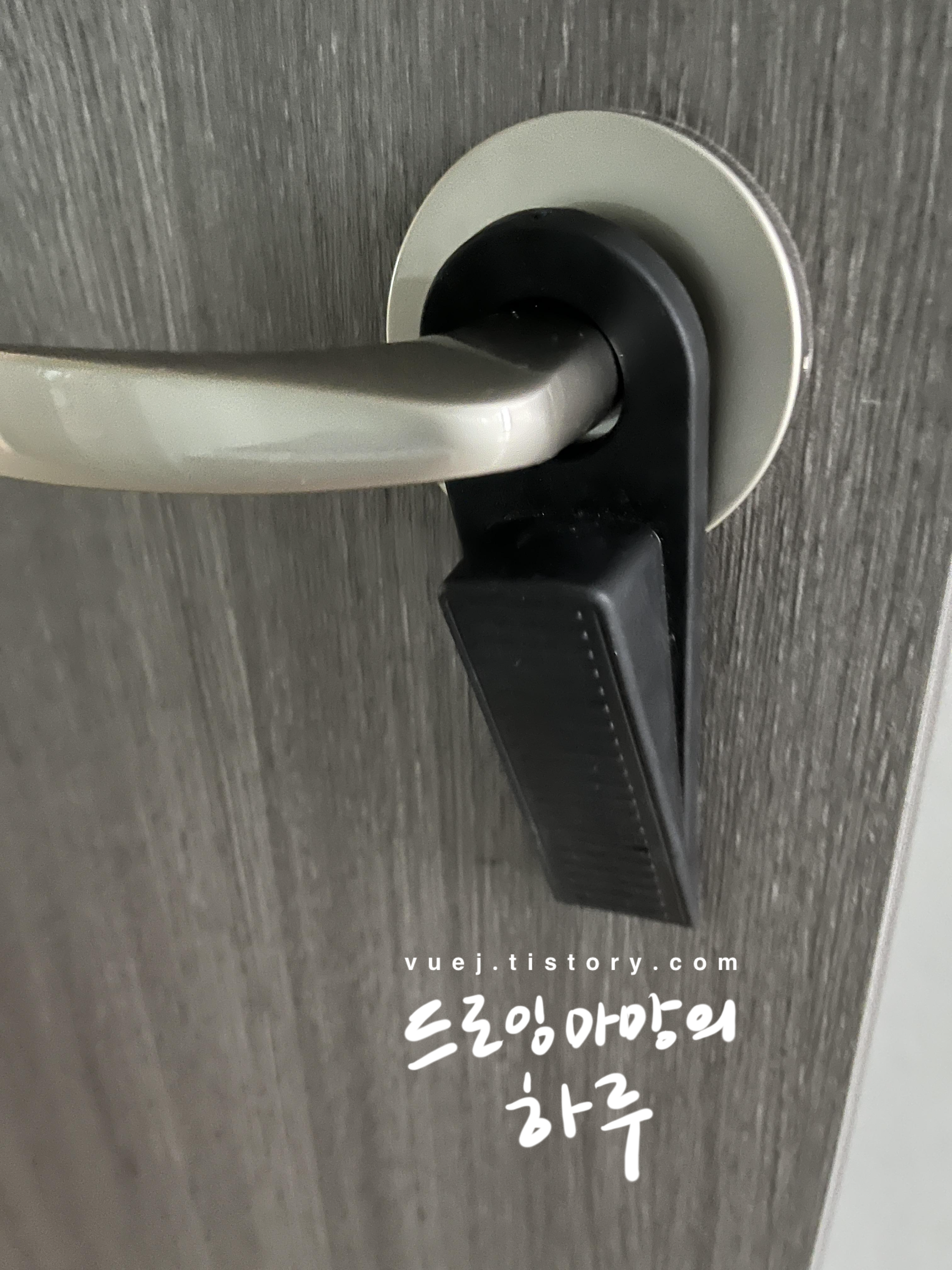 여름이라 더워서 창문 잘 열어놓고 있는데 맞바람 불면 어느새 꽝 닫혀버리는 방문 - - 놀라서 기겁. 색운 두가지고 심플한 디자인에 고리가 있어서 안 사용할 때는 문고리에 걸어두면 편해요. 고리 없는 것도 있는데 걸어두질 못하니까 번거롭고 찾게 되고 하는 단점이 있더라고요. 이것을 추첩합니다 :) 가격은 천원이였던 걸로 기억해요.